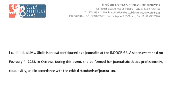 28th October 2025 Reference Czech Athletics Federation Reference Letter signed by Lobor Dinga, Event Director of Czech Indoor Gala and Karolina Farská, Head of Media of Czech Athletics Federation
