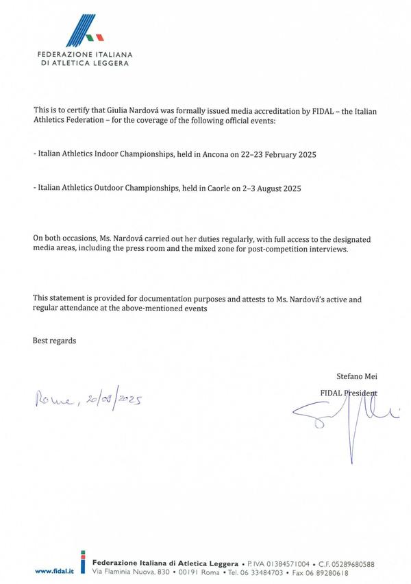 28th October 2025 Reference FIDAL Reference Letter signed by Stefano Mei, President of the Italian Athletics Federation (FIDAL)