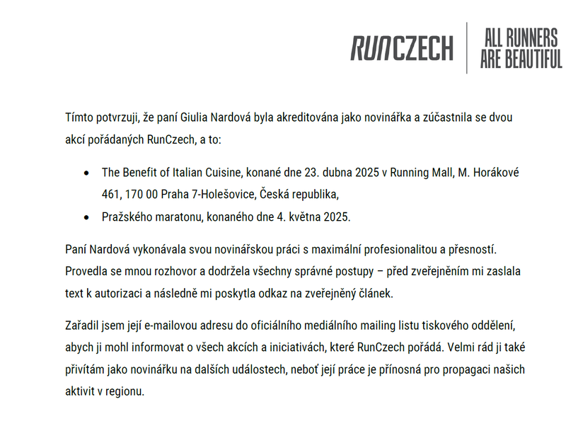 28th October 2025 Reference RunCzech Reference Letter signed by Carlo Capalbo manager of RunCzech Prague Marathon